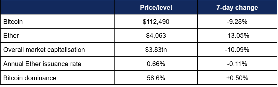 - Overall market capitalisation dropped as low as $3.65tn, before recovering to the current $3.83tn