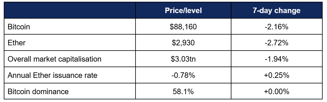 - Overall market capitalisation dropped below $3tn, but remained above the lows from a fortnight ago