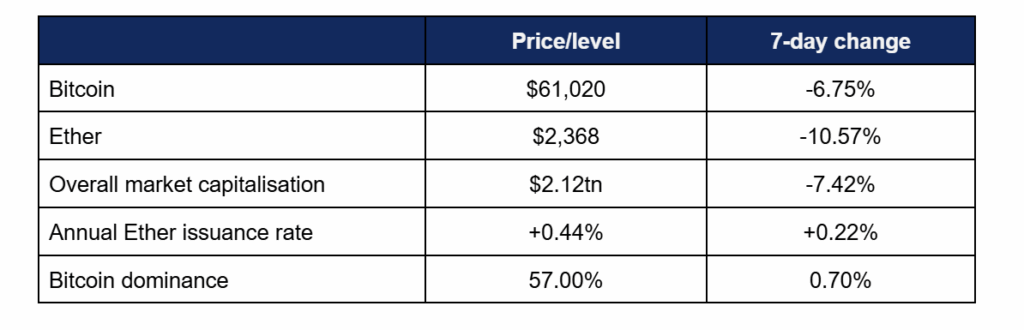 - Overall digital asset market capitalisation decreased to $2.12tn