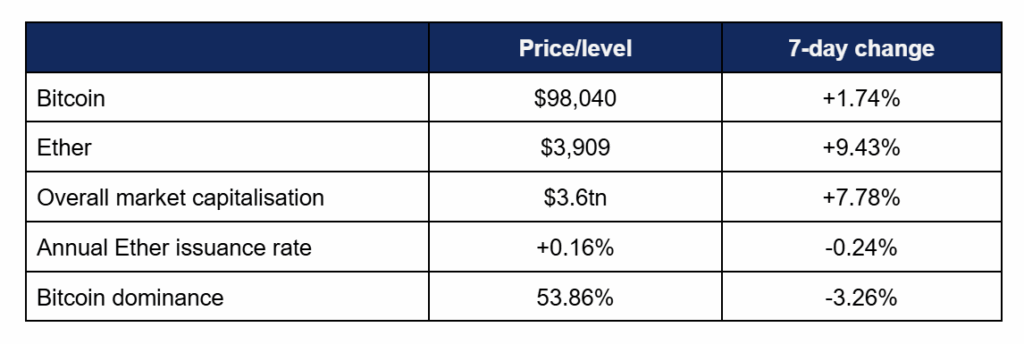 The digital asset market displayed continued strength, not only setting new records, but bouncing back swiftly from both (temporary) martial law in a major market and massive profit-taking leading to the largest liquidations in years. Bitcoin reaching a new all-time high above $100,000 dominated reporting, but elsewhere there were numerous positive developments, including record ETF performance, trading volumes, Apple partnerships, tokenisation progress, and much more.