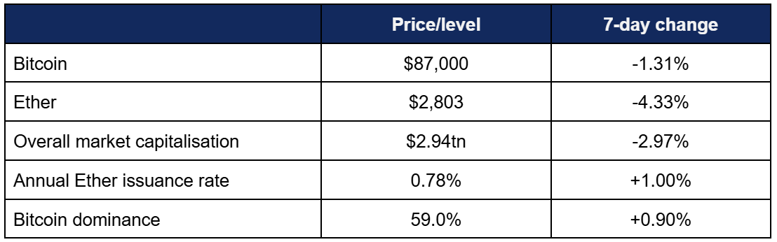 - Overall market capitalisation dropped below $3tn, but remained above the lows from a fortnight ago