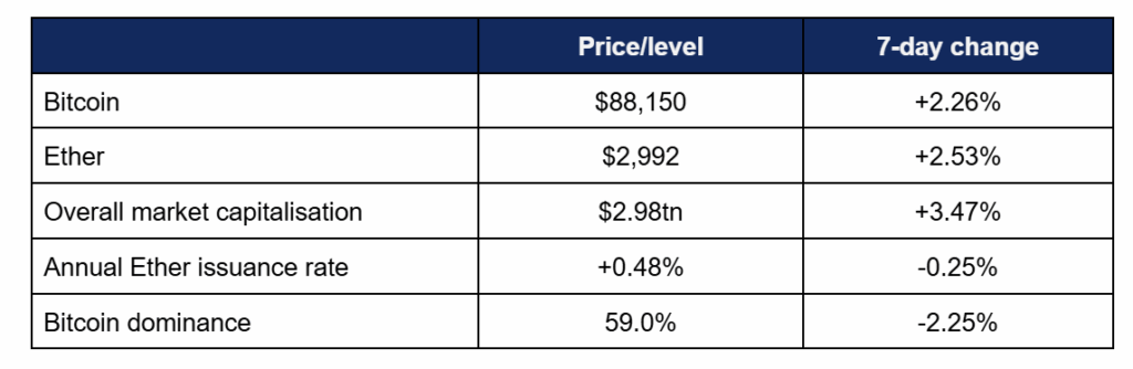 - Overall market capitalisation briefly hit an intraweek high of $3.04tn, before pulling back slightly to current levels